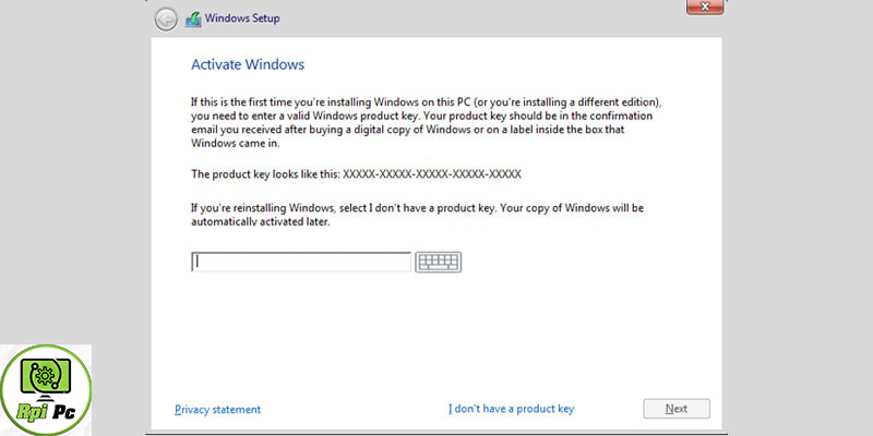 - چنانچه شماره لایسنس ویندوز را تهیه کردید، آن را در این قسمت وارد کرده و دکمه ی Next را بزنید.
